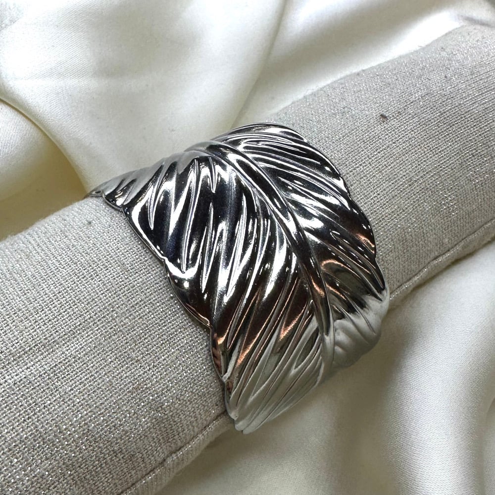Bracciale rigido caratterizzato da un elegante design a piume multiple e sovrapposte, finemente lavorati con incisioni che richiamano le venature naturali della piuma.