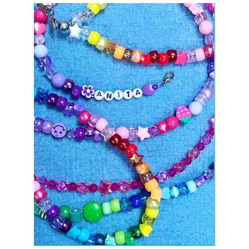 Catenella per mascherina , occhiali , cellulare di perline colorate personalizzabile con nomi o frasi .