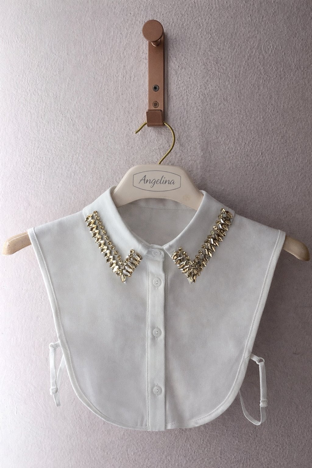 Colletto removibile in tessuto bianco delicato, arricchito da applicazioni gioiello dorate che donano luce e raffinatezza al design. Un accessorio elegante e prezioso, ideale per valorizzare qualsiasi outfit con un tocco sofisticato.